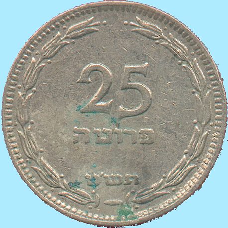 Referencia: 2684 - KM11 Año: 1949/5709 Valor: 10 Prutot Cant: 1 Metal: Bronce Diametro: 27.30 mm. Tirada: 7,500,000 Conservacion: RC |