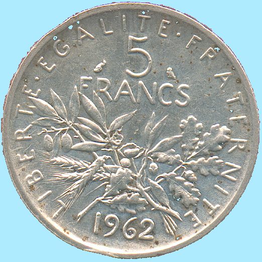 Referencia: 2329 - KM926 Año: 1962 Valor: 5 Francos Cant: 1 Metal: Plata Peso: 12.00 gr. Diametro: 29.45 mm. Tirada: 42,500,000 Conservacion: MBC |