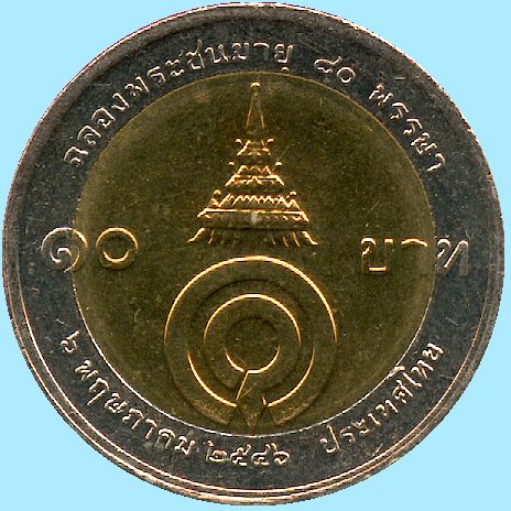 Referencia: 1849 - VS806 Año: 2004/2547 Valor: 10 Bahts Cant: 1 Metal: Bimetálica Peso: 8.44 gr. Diametro: 26.17 mm. Tirada: 3,000,000 Conservacion: SC |