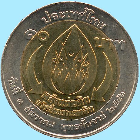 Referencia: 1843 - VS785 Año: 2003/2546 Valor: 10 Bahts Cant: 1 Metal: Bimetálica Peso: 8.44 gr. Diametro: 26.17 mm. Tirada: 1,000,000 Conservacion: SC |