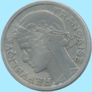 Referencia: 1486 - KM886a.1 Año: 1949 Valor: 2 Francos Cant: 1 Metal: Aluminio Diametro: 27.42 mm. Tirada: 13,683,000 Conservacion: MBC |
