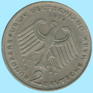 Referencia: 214 - KM124 Año: 1974 Valor: 2 Marcos Cant: 1 Metal: Cupro-Niquel Diametro: 27.42 mm. Tirada: 5,151,000 Conservacion: EBC |