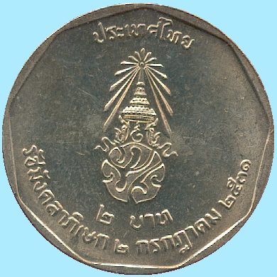 Referencia: 1884 - VS516 Año: 1989/2532 Valor: 2 Bahts Cant: 1 Metal: Niquel Diametro: 22.11 mm. Tirada: 3,000,000 Conservacion: EBC |